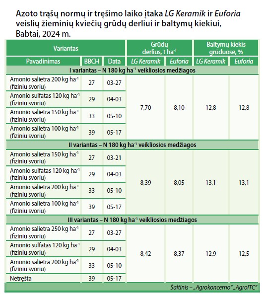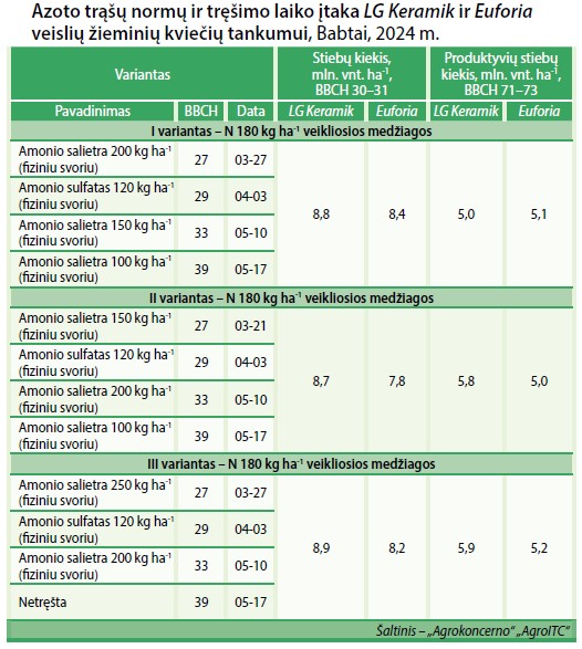 2024 metais tyrimams buvo pasirinktos žieminių kviečių veislės LG Keramik ir Euforia. Augalų vegetacijos periodu nuo pavasario visuose tiksliųjų bandymų variantuose buvo išlaikytas bendras 180 kg ha-1 azoto veikliosios medžiagos kiekis.