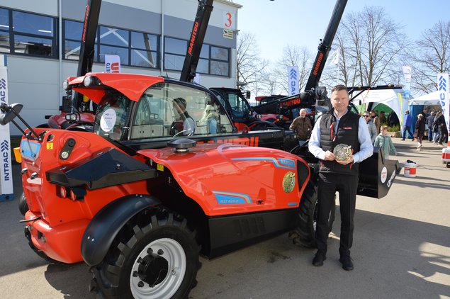 Elektrinio krautuvo apdovanojimu džiaugiasi (iš kairės) „Ivabaltės“ produktų vadovas Arnoldas Jonytis ir „Weidemann“ atstovas Vincentʼas Nicoletis